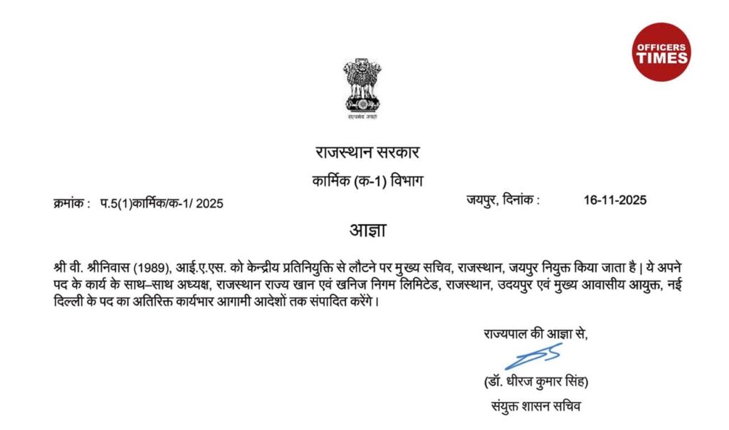 भारतीय प्रशासनिक सेवा में 1989 बैच के वरिष्ठ आईएएस अधिकारी वी. श्रीनिवास पूर्व मुख्य सचिव सुधांशु पंत की जगह ले रहे हैं। आईएएस सुधांश पंत अब केंद्र में प्रतिनियुक्ति पर चले गए हैं और अपनी सेवानिवृत्ति तक दिल्ली में ही सेवाएं देंगे। आईएएस वी. श्रीनिवास, जो पिछले सात वर्षों से केंद्र सरकार में विभिन्न महत्वपूर्ण पदों पर कार्यरत थे, अब सितंबर 2026 तक राजस्थान की प्रशासनिक मशीनरी को नई दिशा देंगे। उनकी नियुक्ति के साथ ही राज्य में बड़े पैमाने पर नौकरशाही फेरबदल की अटकलें तेज हो गई हैं, जिसमें मुख्यमंत्री कार्यालय से लेकर जिला प्रशासन तक बदलाव संभावित हैं।